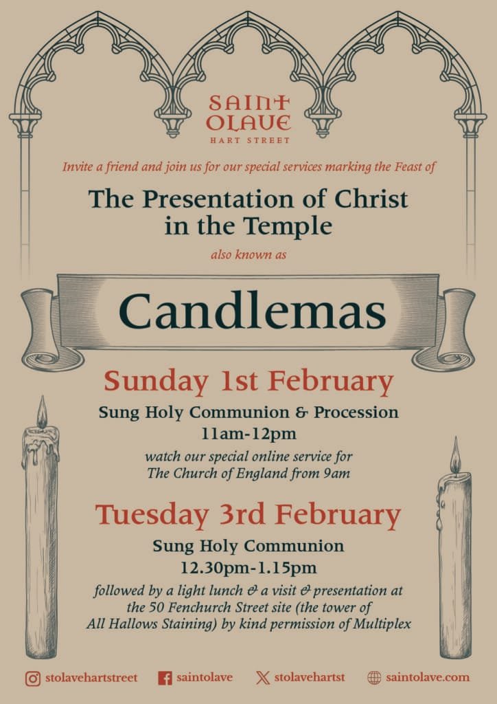 Sunday 1st February 2026 – 11am-12pm – Sung Holy Communion with Procession, with music from the St Olave Scholars. Look out for our special online service recorded for The Church of England, which will be available on their YouTube and Facebook pages from 9am.