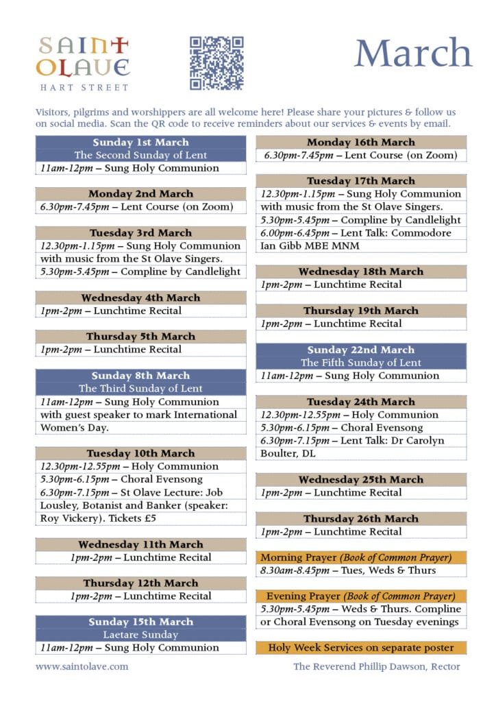 Please join us for our special services and events at St Olave Hart Street this March. Join us for our online Lent Course, our Lent Talks and the start of our new series of St Olave Lectures. This month we are delighted to start offering Choral Evensong on two occassions every month! – do join us on the second and fourth Tuesday evenings of each month, from 5.30pm-6.15pm.