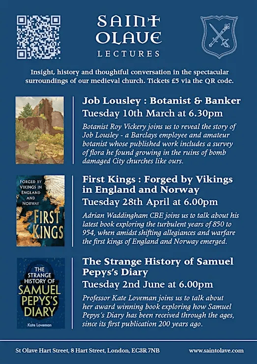 Please join us in what Samuel Pepys called his “own church” for Compline by Candlelight followed by our next St Olave Lecture. Professor Kate Loveman joins us to talk about her award winning book exploring how Samuel Pepys’s Diary has been received through the ages, since its first publication 200 years ago.