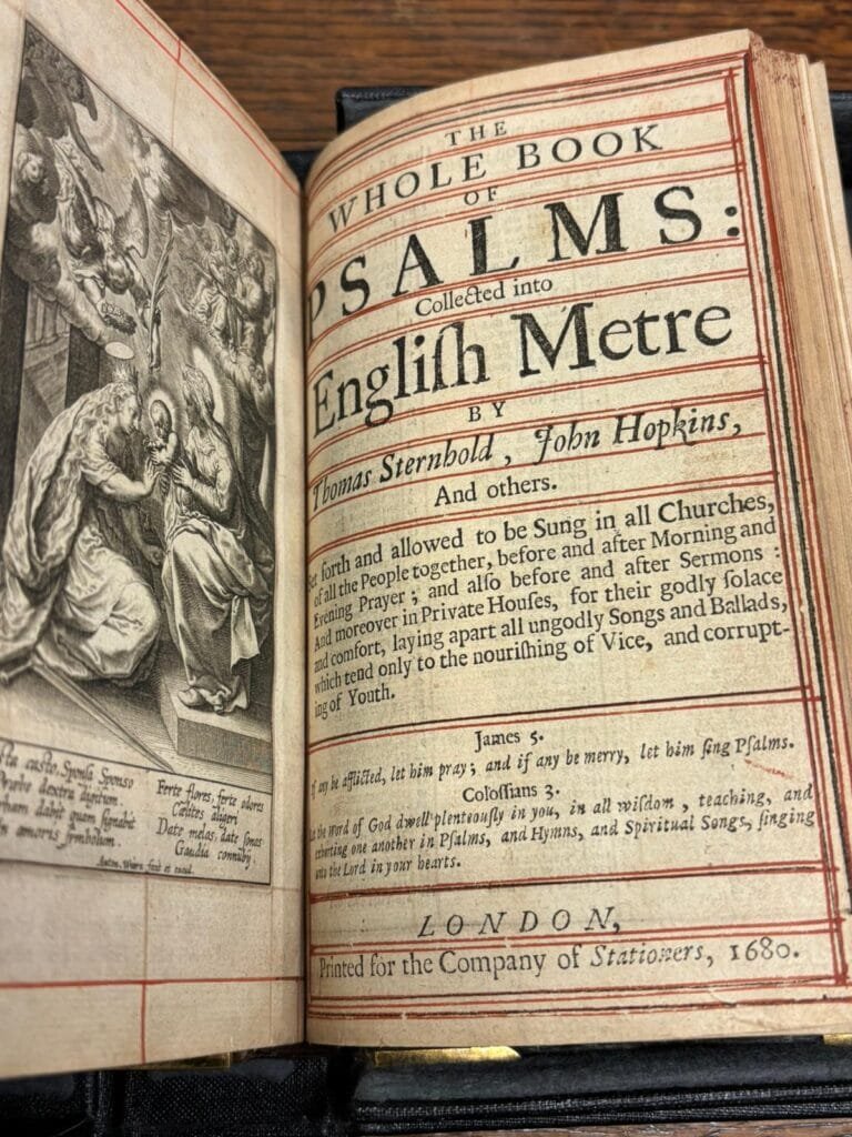 As a result of a bequest from Mrs Pepys-Cockerell, the church came into possession of Samuel Pepys Prayer Book, which includes a metrical version of the Psalms dated 1680. The book was enriched with engravings and sacred pictures and rulings of red lines. The title page, illustrated by hand, is thought to be the work of Pepys’s friend Edward Cocker, the Writing Master. The embellished prayer book follows the example of Charles II. The book survived the near total destruction of the church during WW2 after being stored, along with other valuable documents, in the crypt of St Petroch’s Church, Exeter. It will be on display before and after Choral Evensong.